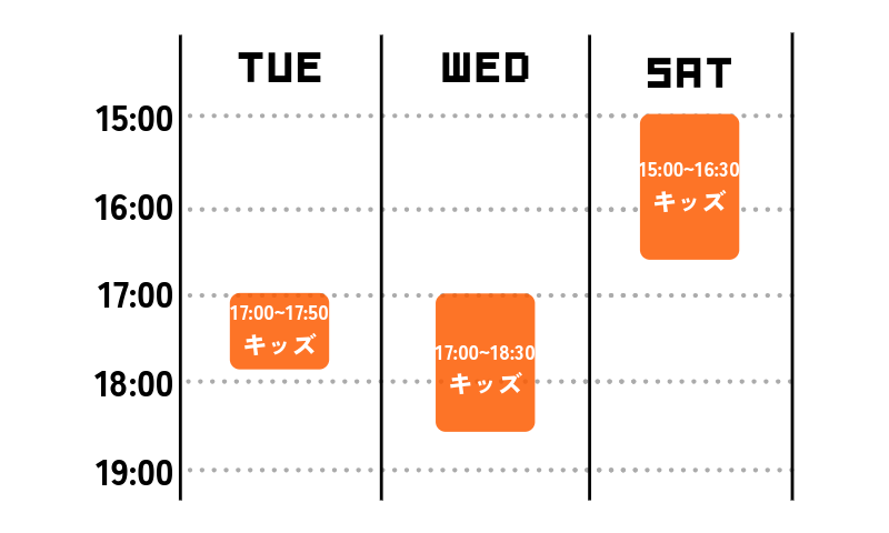 | キッズ | 5歳〜15歳 | 火曜 17:00〜17:50(器械体操) 水曜 17:00〜18:30 土曜 15:00〜16:30 |